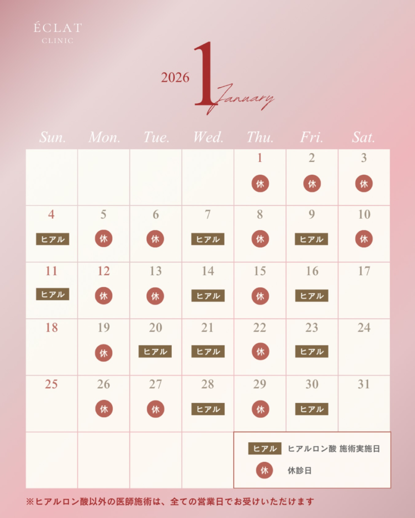 2025年12月15日 1月の診療スケジュールをお知らせいたします。診療日・休診日につきましては、下記画像をご確認ください。 ご予約が集中しやすい日程もございますので、ご希望の方はお早めのご予約をおすすめしております。 皆さまのご来院を心よりお待ちしております。